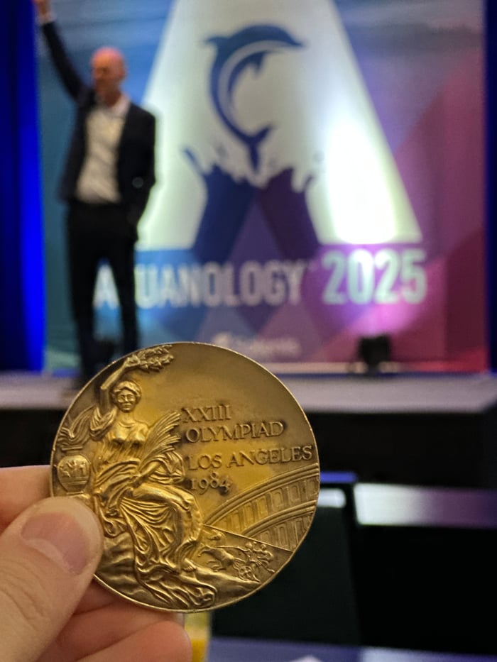 Three-time Olympic gold medalist Rowdy Gaines shares his story and vision while displaying his 1984 Olympic medal during the Solenis Aquanology Forum.